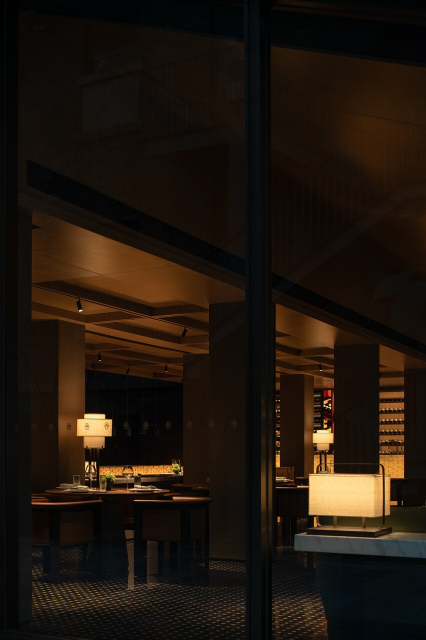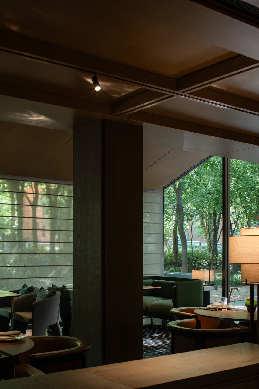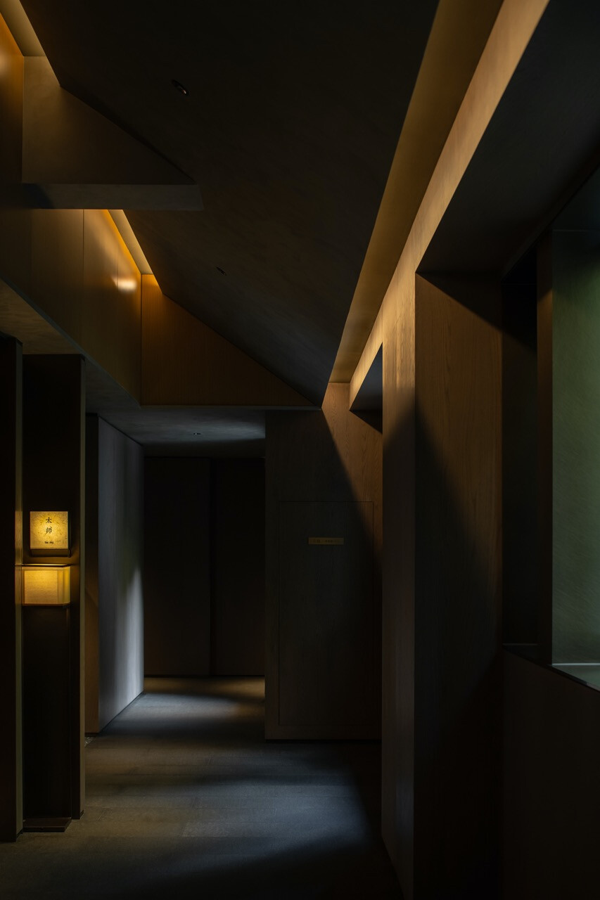 散台處的別致造型引導出空間中的點睛留白,大面積的落地窗讓天光入畫,彷彿那一雙打開畫冊的大手,拂開塵霧,得見往日流光。由青灰石材鋪就的樓梯步入二層,接待處延續了矩形的設計語言,更加清晰的軸線佈局運用到空間中,以走廊分割功能空間,每個包廂獨立而又貫通,脈絡清晰的線性格局述說武漢古往今來的生活圖景。三層的佈局呈現環繞式,採取了中式園林當中的複廊形式,以長廊連接中心包間區域和露台,移步易景,共聯江詩繾綣,畫幅綿長。