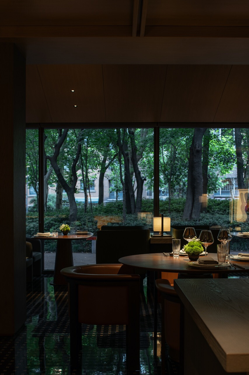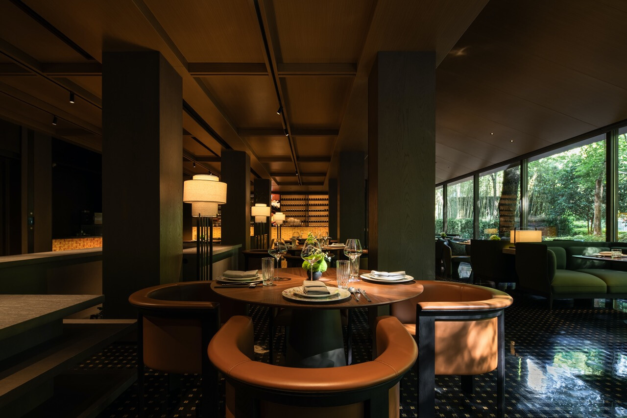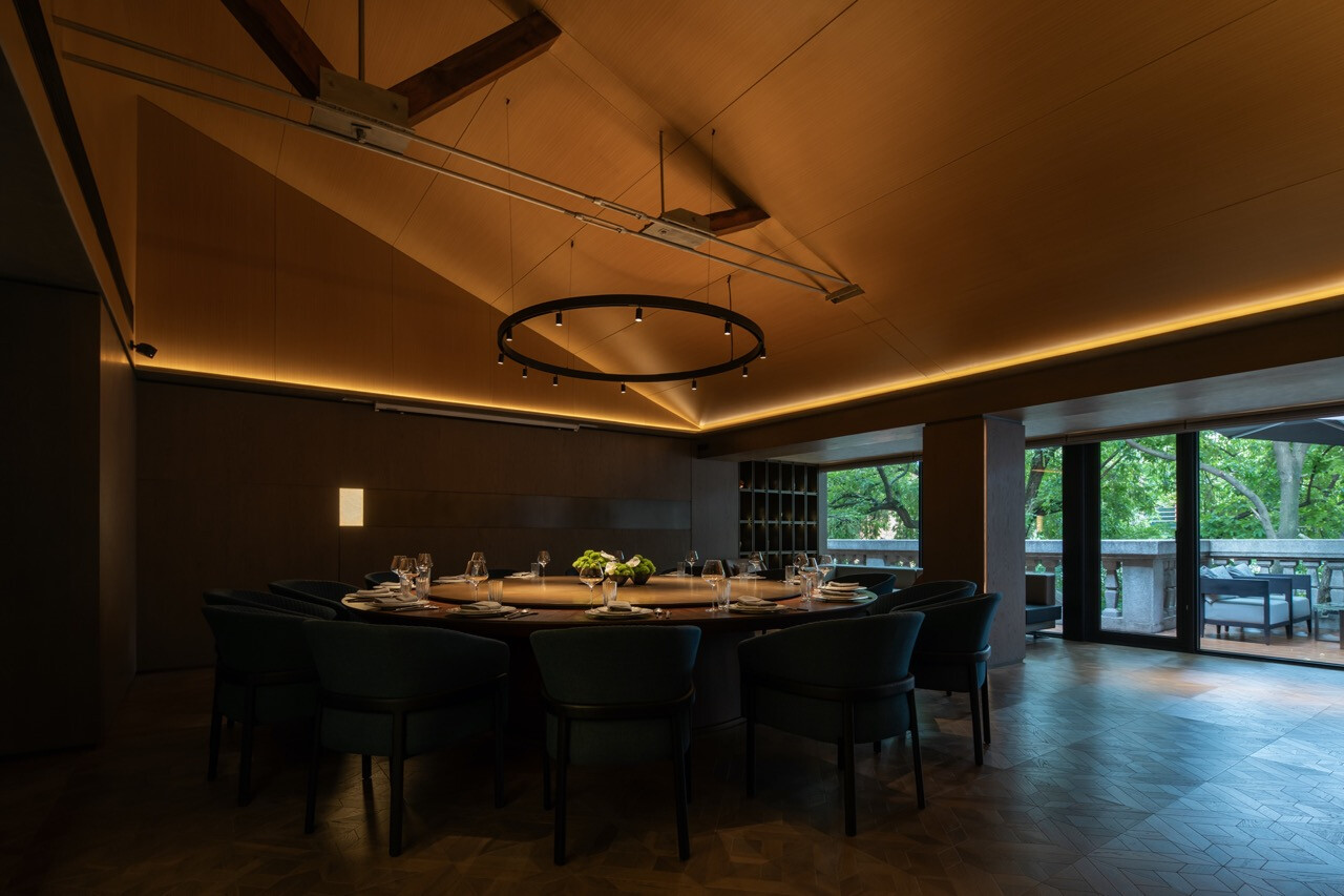 散台處的別致造型引導出空間中的點睛留白,大面積的落地窗讓天光入畫,彷彿那一雙打開畫冊的大手,拂開塵霧,得見往日流光。由青灰石材鋪就的樓梯步入二層,接待處延續了矩形的設計語言,更加清晰的軸線佈局運用到空間中,以走廊分割功能空間,每個包廂獨立而又貫通,脈絡清晰的線性格局述說武漢古往今來的生活圖景。三層的佈局呈現環繞式,採取了中式園林當中的複廊形式,以長廊連接中心包間區域和露台,移步易景,共聯江詩繾綣,畫幅綿長。