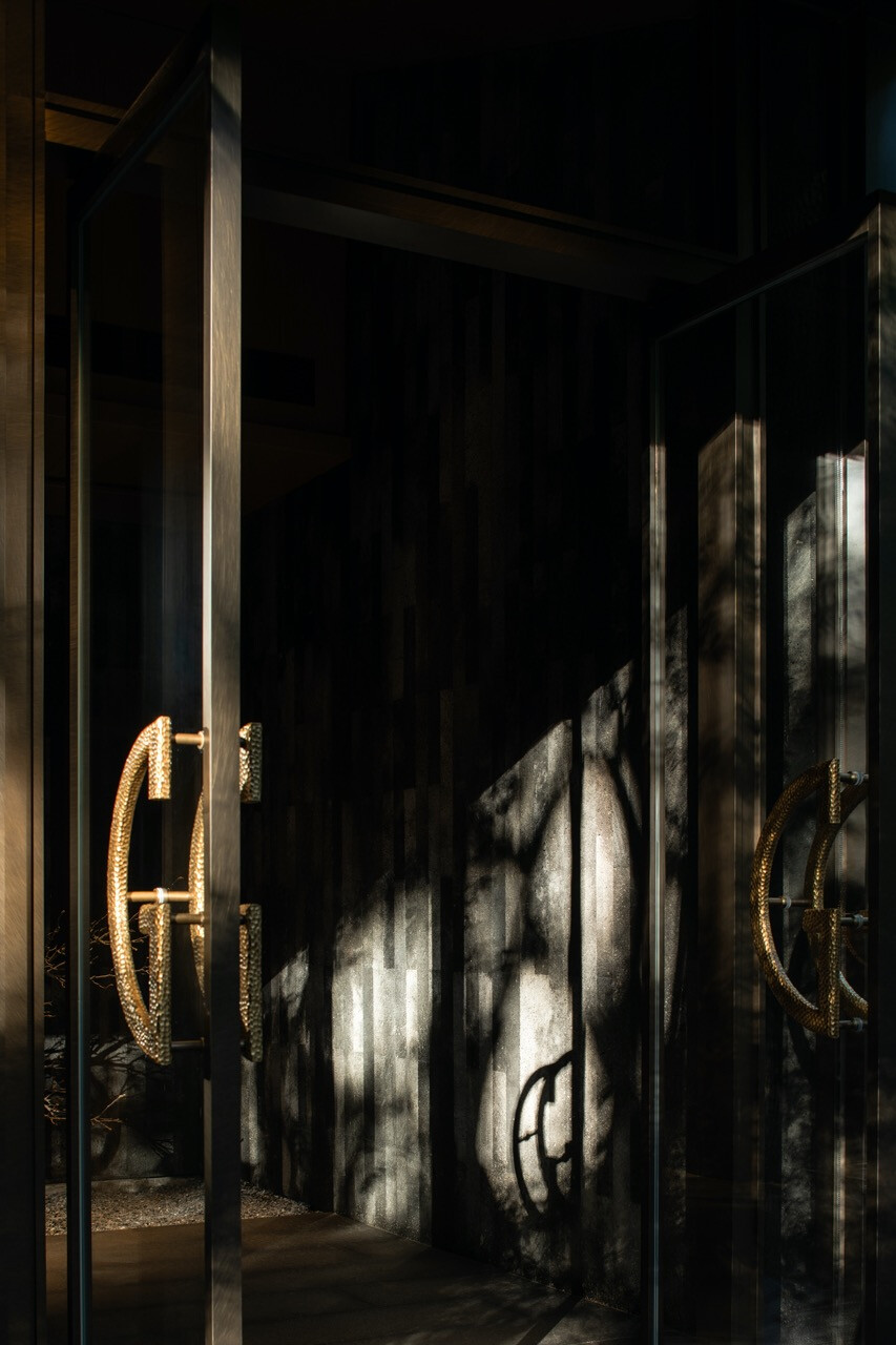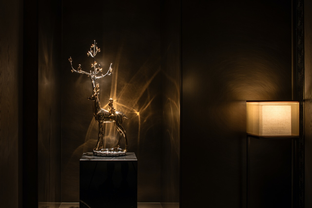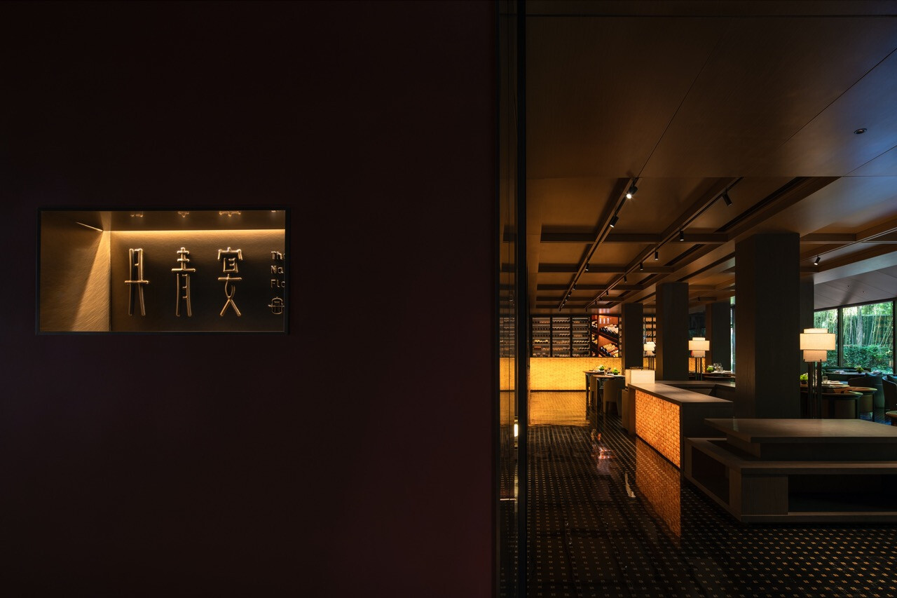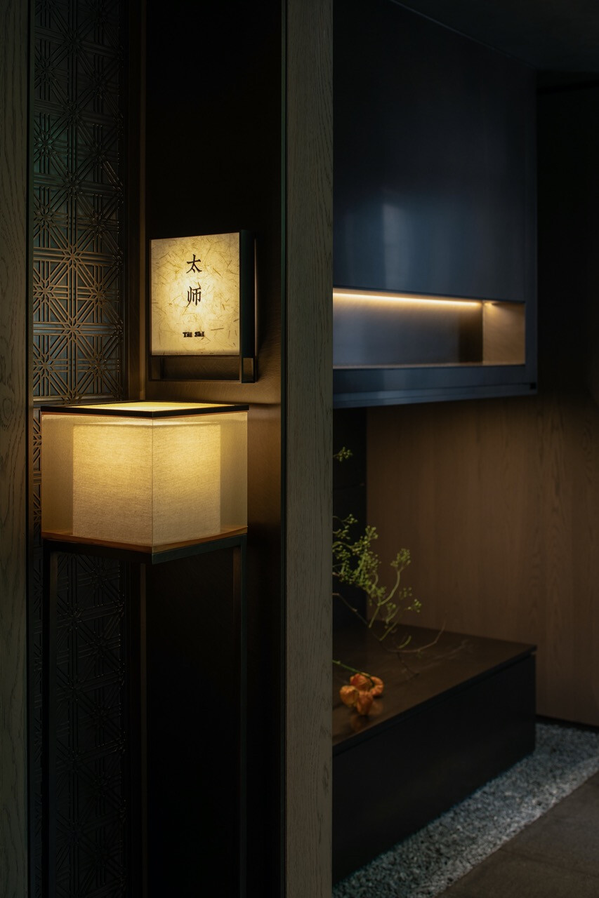 以質樸青綠作為主角基調,搭配朱紅色的大面積布藝牆面,整體氛圍營造出一種古樸雅緻的東方意味。入口處青黑色大理石鋪就的地面與朱砂紅牆面形成強烈對比,引人入勝,兩種反差極強的色彩大面積的展開,大膽而毫不掩飾的展示整個中華文化中雍容,大方的精神氣韻。步入前廳,整齊排列的語言形式解讀了設計中對於禮制形制的破除與重構:依照軸線排列的序列性→豎向圓柱體塊的運用,在打破中構建新的秩序,追求空間形式中的和而不同。在燈具的選擇上,也選取了多種類宮燈造型的品類,與空間中的古意和韻而唱。