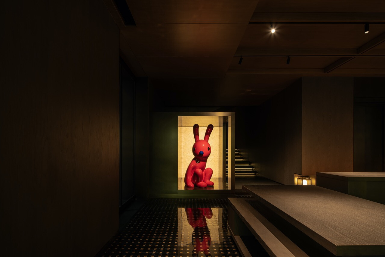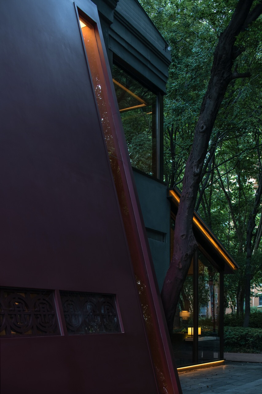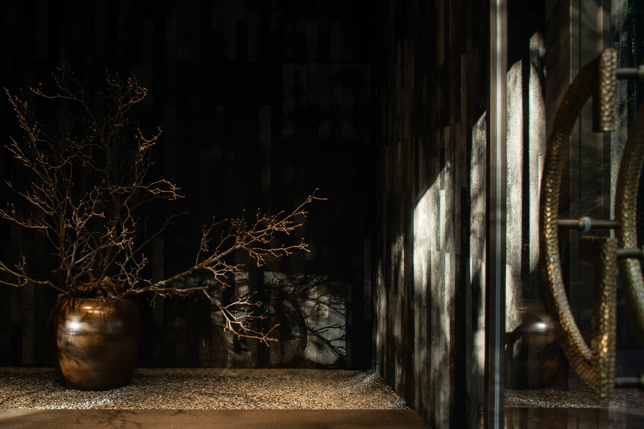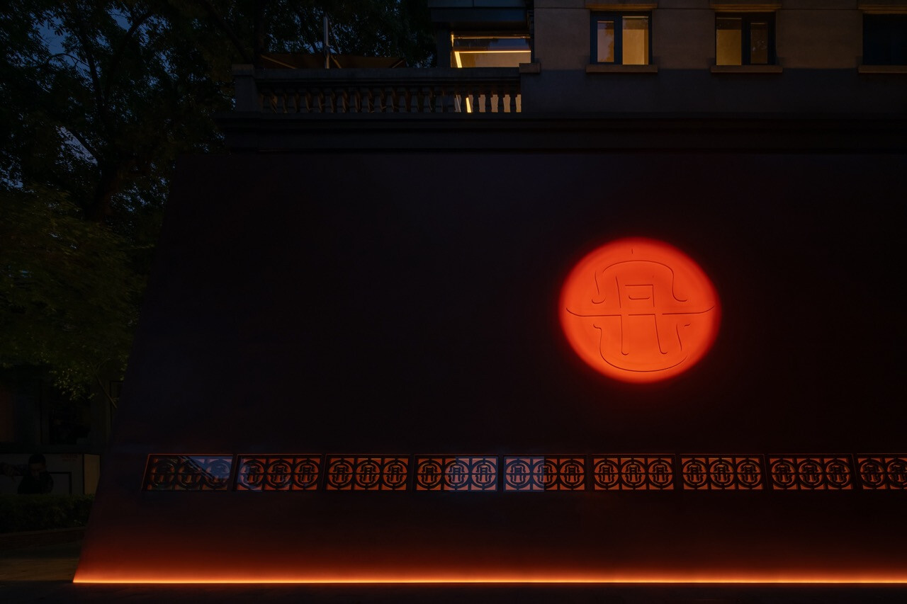 一抹丹砂,居於前,形似裙裾,在青灰色的畫布中緩緩遊行,亦步亦趨,帶人入畫丹青。賦予動感的幾何門臉造型,搭配朱砂的濃郁色彩,是品牌標誌性的的整體呈現。入口的巧思妙想,長而幽深的走廊,緩緩透露的天光,讓人猶入畫廊,揭開畫匣的瞬間,已入丹青江夏。