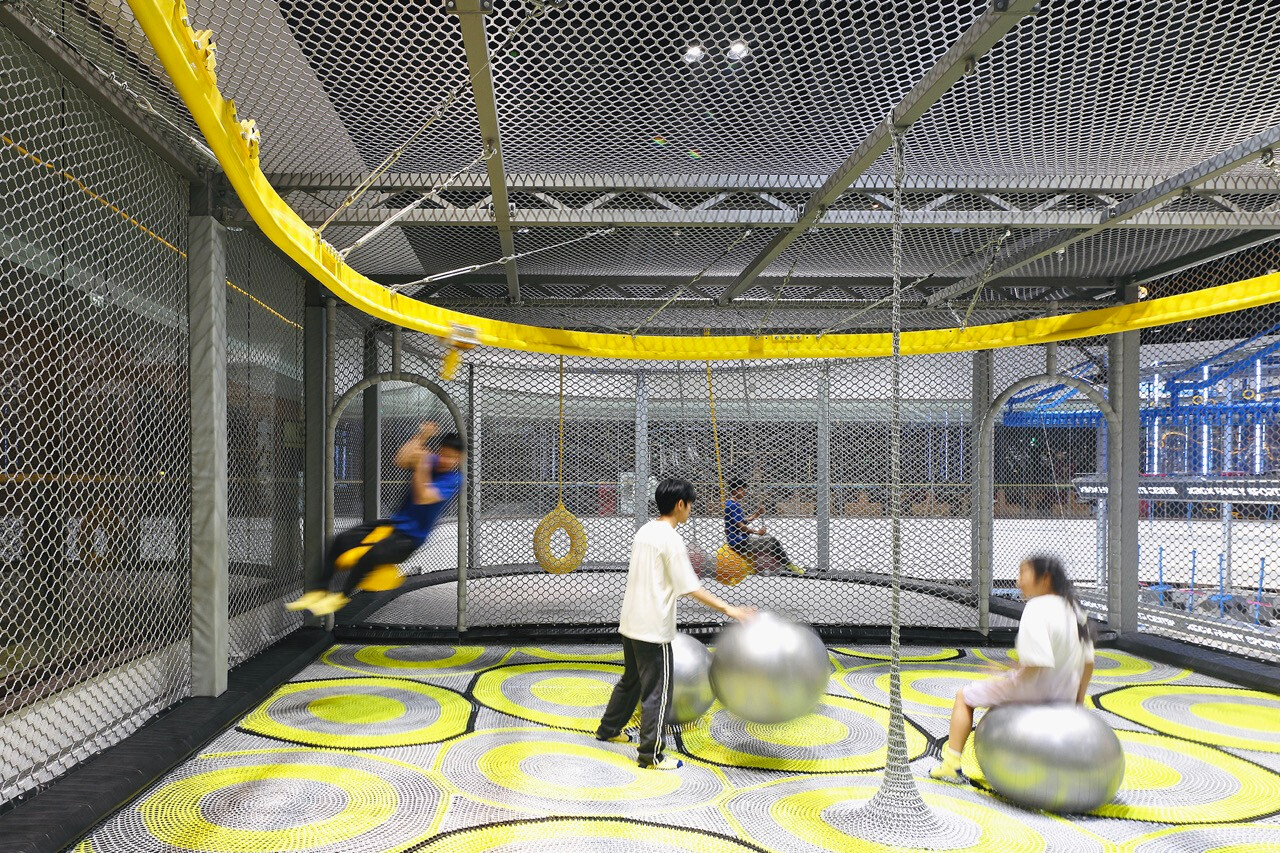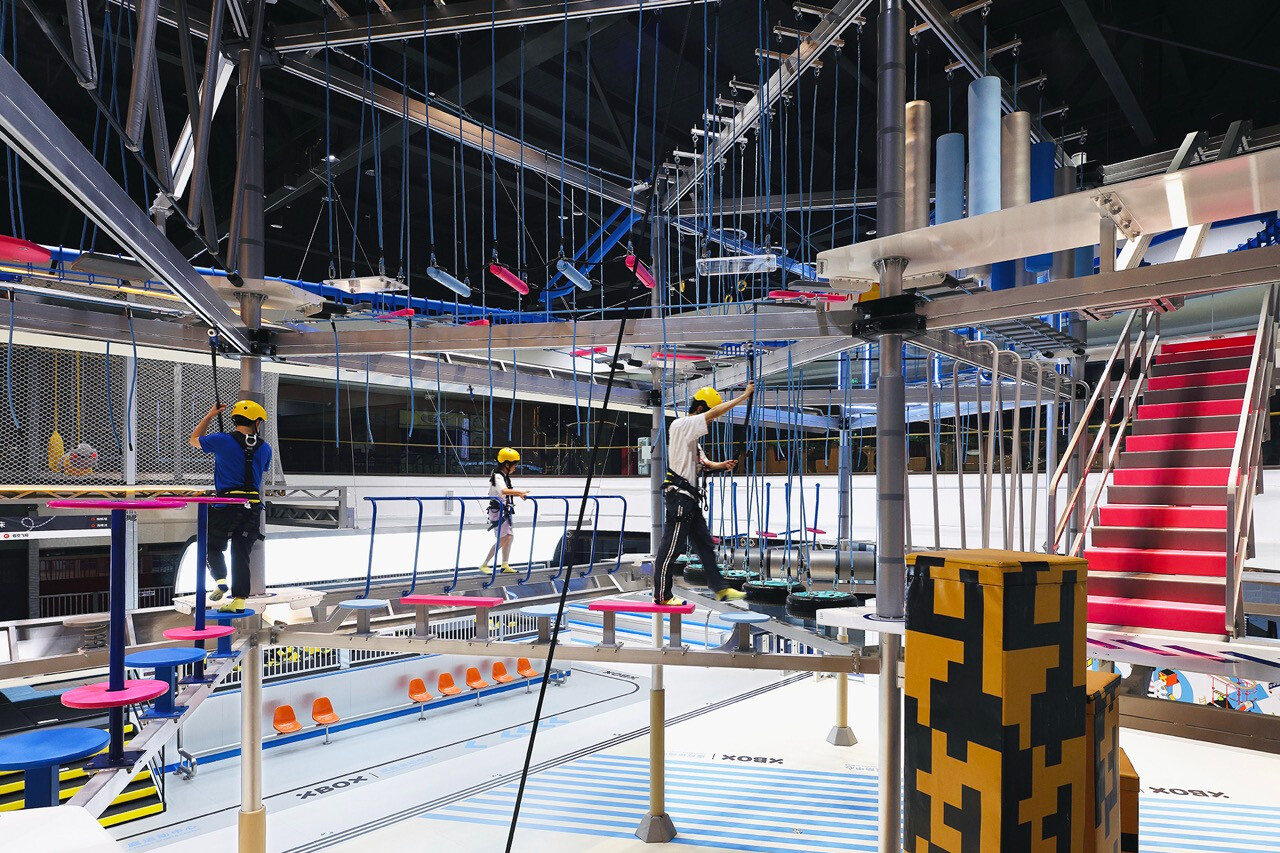 然而,對 Z 世代而言,價值不再只來自於擁有,而是來自於參與。XBOX 家庭運動中心正是基於這樣的世代洞察,將近三十項體驗型設施編織成一條連續的冒險路徑,讓刺激、探索與成就感層層堆疊。高達十一公尺的滑梯系統,以速度作為情緒的引爆點;而超過二十公尺的透明高空隧道,則讓身體懸浮於空中,視線俯瞰整個場域,形成立體而強烈的空間感知。這些設施不只是娛樂工具,更是空間節奏的轉折節點。高空拓展區以多重關卡構成,平衡、判斷、力量與耐力在不同關卡中被輪番測試。這種循序推進的設計,使參與者在無形中進入一種專注狀態,彷彿身處一場現實版的冒險遊戲。而披上像素語彙的梅花樁,則巧妙地喚醒集體記憶,讓童年遊戲的純粹快樂,在當代空間中重新被召喚。這種跨世代的情感連結,使場域不再只屬於某一個年齡層。